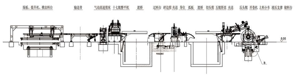 本設(shè)備的工作流程:本設(shè)備是將鋼板(各種金屬材料卷)通過整平后、定尺橫剪的方式把鋼板加工成客戶需要尺寸的專用剪切設(shè)備。該生產(chǎn)線的主要設(shè)備由收紙機(jī)、液壓上料小車、開卷機(jī)、接料鏟頭、整平主機(jī)、渡橋、NC定尺送料機(jī)、靜電覆紙機(jī)構(gòu)、高速剪床、集料等機(jī)構(gòu)構(gòu)成,中間輔以運(yùn)料、緩沖、引導(dǎo)、輸送、出料等裝置。