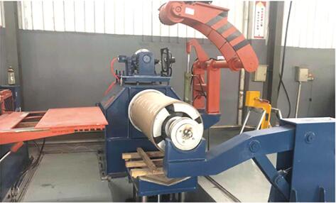 設備在工作時開卷機處于送料狀態,板料進入整平機校平后,再經電眼控制活套、側向機構進入NC定尺裝置,NC定尺裝置按設定好的尺寸定尺向后工序剪床送料;當NC送料達到設定尺寸時,設備停止送料同時將信號傳給剪床,由剪床將板料切斷,切下的板料經輸送裝置送入集料架整齊堆垛,堆垛鋼板的升降臺可隨堆垛鋼板高度的增加而自動下降;當堆垛鋼板張數達觸摸屏設定值時,生產線自動停機,此時人工控制降下升降臺,將出料臺車開出,同時開進另一臺出料臺車,即進入下一工作循環。