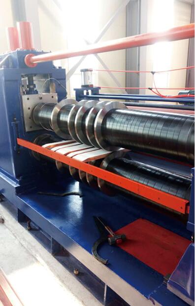 本設備的送料、剪切、收料等三個工作主機在工作時是自動協調的,不會對板料產生拉伸動作,杜絕卷料在本設備上的拉伸變形,同時縱剪時板料處于自由剪切狀態,不會產生剪切跑偏現象;本設備之張力產生站可以產生各帶間均衡的、整體可調節的張力,以保證適應不同板料收料時必需之張力,同時也有效保證了各帶卷之相對松緊度;本設備具有定長切斷功能,當設備縱剪到預先設定長度或到尾料時,設備將自動均勻降速,無料自動停機,直至速度為零,然后自動或人工操作按扭進行分卷剪切。