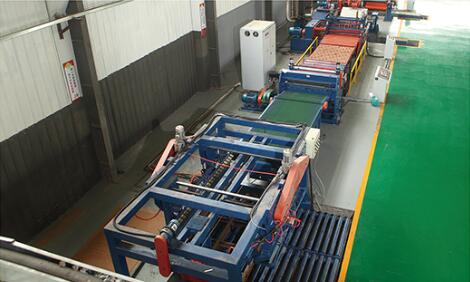 設(shè)備在工作時開卷機(jī)處于送料狀態(tài),板料進(jìn)入整平機(jī)校平后,再經(jīng)電眼控制活套、側(cè)向機(jī)構(gòu)進(jìn)入NC定尺裝置,NC定尺裝置按設(shè)定好的尺寸定尺向后工序剪床送料;當(dāng)NC送料達(dá)到設(shè)定尺寸時,設(shè)備停止送料同時將信號傳給剪床,由剪床將板料切斷,切下的板料經(jīng)輸送裝置送入集料架整齊堆垛,堆垛鋼板的升降臺可隨堆垛鋼板高度的增加而自動下降;當(dāng)堆垛鋼板張數(shù)達(dá)觸摸屏設(shè)定值時,生產(chǎn)線自動停機(jī),此時人工控制降下升降臺,將出料臺車開出,同時開進(jìn)另一臺出料臺車,即進(jìn)入下一工作循環(huán)。